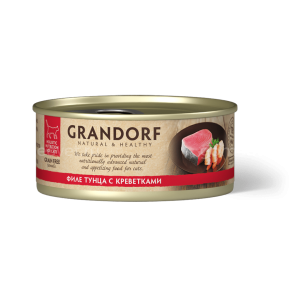 О товаре GRANDORF Консервы для кошек, филе тунца с креветками в бульоне, 70 г